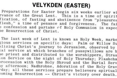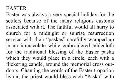 An account of Easter celebrations at the Ukrainian Orthodox Church of the Assumption of the Holy Mother of God in Mamornitz, Saskatchewan. Excerpt from Mamornitz: A History of a Ukrainian Pioneer Community by Jennie Zayachowski.