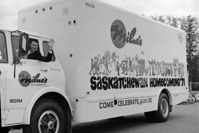 Un véhicule du ministère de l’Industrie et du Commerce faisant la promotion de Saskatchewan Homecoming ’71, le 20 mai 1969. PAS Photo 69-178-01.