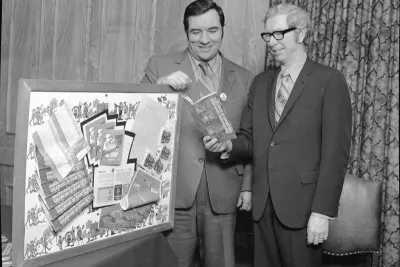Wilf Gardiner et Les Donnelly, directeur de Homecoming ’71, examinant le calendrier des événements de Homecoming ’71, le 24 février 1971. PAS Photo 70-1400-02.