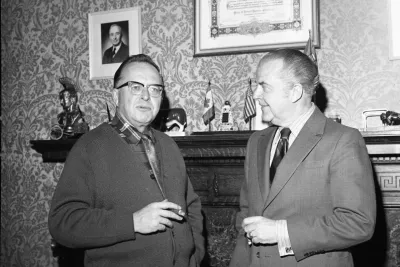 Le premier ministre Ross Thatcher discute avec l’animateur de télévision Elwood Glover, récipiendaire d’un certificat Homecoming ’71, le 17 février 1971. PAS Photo 70-1419-11.