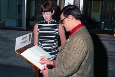 Un visiteur signe le registre des invités de Homecoming ’71 à l’hôtel de ville de Weyburn, en mai 1971. PAS Photo 71-219-56.