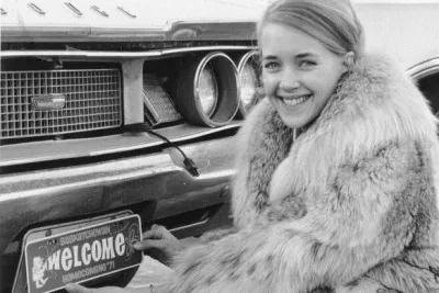 Une mannequin non identifiée présente une plaque automobile commémorative spécialement conçue pour Homecoming ’71, le 3 mars 1971. PAS Photo R-A24483?.