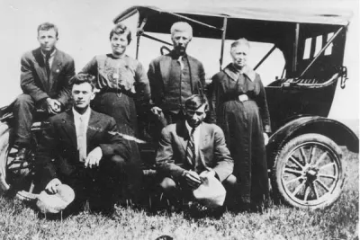 Members of the Boutin, Leclerc and Bertholet families in front of a Ford car, in Cantal, 1915.