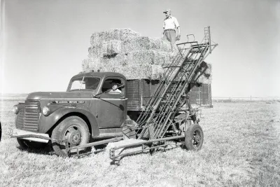 Chargement de balles de foin à O.A. Ferme Williamson, au nord de Ponteix, 1956. Photographe : Ralph Vawter. PAS Photo Series S73 no. 56-228-002.