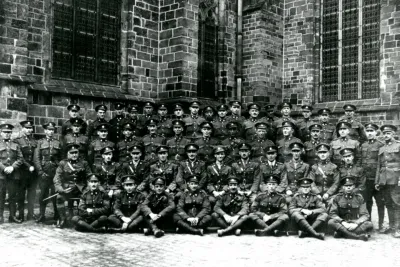 Group photo of officers and N.C.O.'s of the 46th Battalion, taken at Wawre, Belgium, after Armistics Day, 1918. PAS Photo R-A14119.